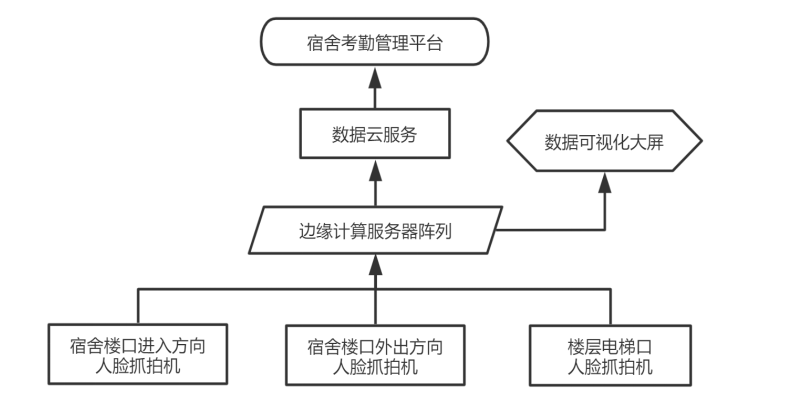 基于本校宿舍基本情況,結(jié)合學(xué)校運(yùn)營(yíng)管理模式,將宿舍考勤系統(tǒng)軟硬件模塊按照如下架構(gòu)圖部署。綜合樓大門處出入兩方向根據(jù)樓道寬度分別安裝2-4個(gè)人臉識(shí)別抓拍機(jī),6-11樓層電梯口各安裝2-3個(gè)人臉識(shí)別抓拍機(jī),抓拍機(jī)視頻圖像數(shù)據(jù)通過(guò)網(wǎng)絡(luò)路由設(shè)備實(shí)時(shí)匯總*宿管邊緣計(jì)算服務(wù)器陣列,服務(wù)器將視頻流信息中解析出的人臉數(shù)據(jù)與校方學(xué)生人臉庫(kù)信息進(jìn)行實(shí)時(shí)N比N快速驗(yàn)證,獲得學(xué)生身份信息,將對(duì)比結(jié)果實(shí)時(shí)顯示在數(shù)據(jù)可視化大屏上。結(jié)合學(xué)校考勤及宿舍管理邏輯,將各維度報(bào)表分析推送*云服務(wù)器,校方管理人員可通過(guò)宿舍考勤管理平臺(tái)獲取數(shù)據(jù)分析結(jié)果。